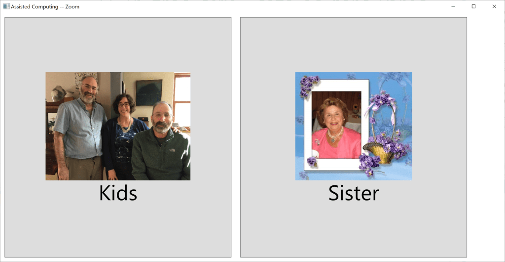 Zoom has an API that allows programmatic access to its capabilities. I wrote a Zoom launcher app for Windows (Figure 1, below). Instead of having to search emails for a cryptic URL link, the user launches a desktop app that and sees pictures of the people he’ll talk to. The Zoom meeting room for my siblings and me is on the left. The one on the right belongs to the family of his sister, my Aunt Saretta. In accordance with the First Principle of AC, the Assistor sets these up, using a separate screen (not shown).