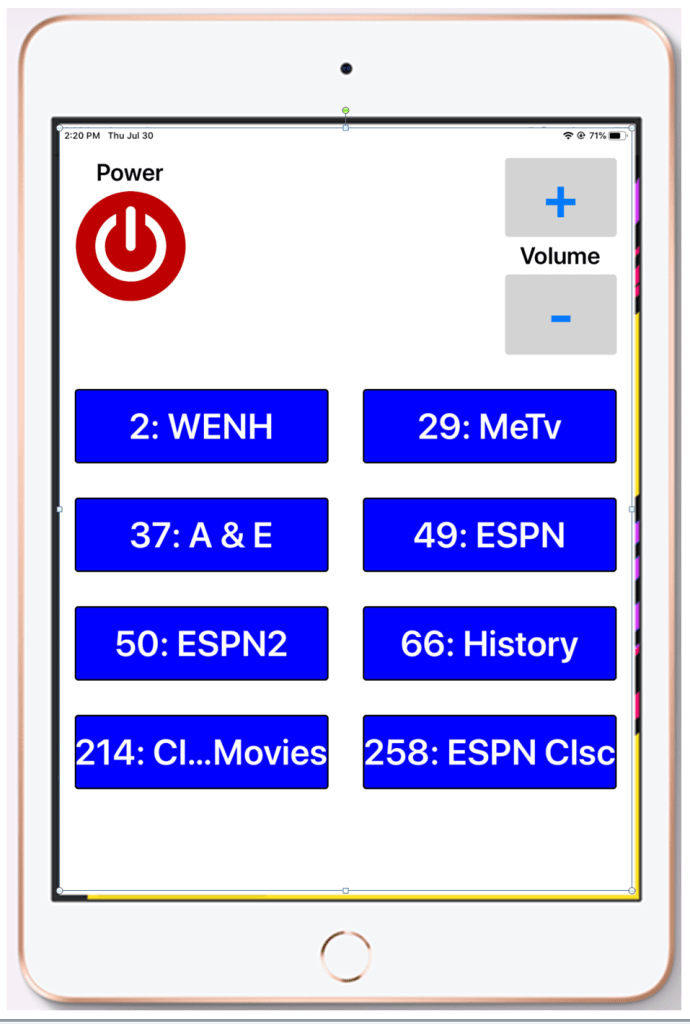 I do the configuration of the channel buttons remotely. The list of buttons and channels resides in a simple text file on my Google drive. The iPad app checks this file at startup time. I’m ready for when he says, “I don’t care about History anymore, but I want to watch Robert Irvine’s Restaurant Impossible on the Food Channel.”